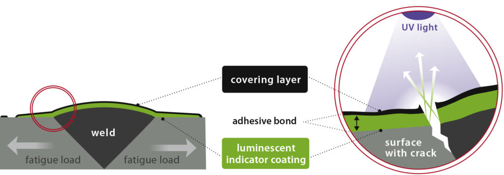 The application is straightforward: after thorough cleaning, the indicator coating is applied first, followed by the top coat – similar to conventional painting. If a crack occurs during operation, the coating also cracks. Under UV light, the indicator coating glows at the crack sites – a clear signal for inspectors. The inspection is carried out either manually using a UV lamp or automatically using a camera and image analysis.
