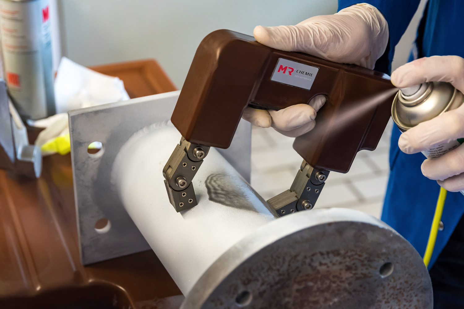 Das Magnetpulver, mit dem der Prüfabschnitt bespült wird, ist in einer Trägerflüssigkeit suspendiert. Es können kleinere Korngrößen als bei der Trockenprüfung verwendet und damit feinere Risse nachgewiesen werden.