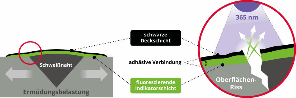 Das Risslumineszenzverfahren, entwickelt und patentiert von der Bundesanstalt für Materialforschung und -prüfung (BAM), siedelt sich zwischen temporären Prüfverfahren und SHM-Systemen an. Die von MR Chemie entwickelte Riluminati-Beschichtung wird auf das zu überwachende Werkstück aus Stahl oder Aluminium aufgetragen und verbleibt dort während des normalen Betriebs. Entstehen im Grundmaterial Oberflächenrisse, werden diese unter UV-Licht als fluoreszierende Anzeigen sichtbar. Für die Inspektion wird lediglich eine UV-Leuchte und unterwiesenes Personal benötigt – das macht die Anwendung besonders einfach und kostengünstig.